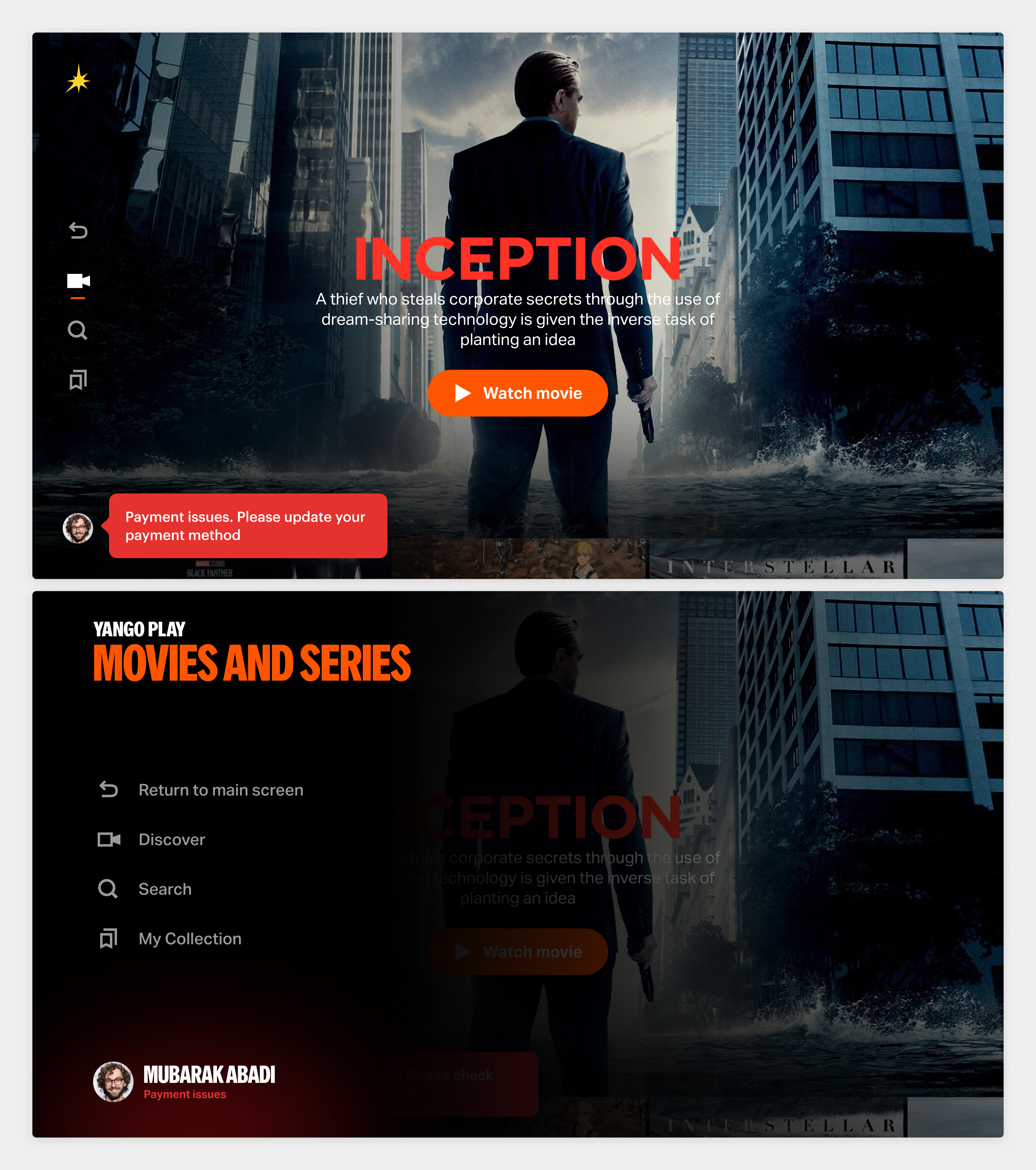 On TV, the notification appears upon app launch and receives initial focus. Users who want to update their payment method only need to press once on the remote controller to see more information.
